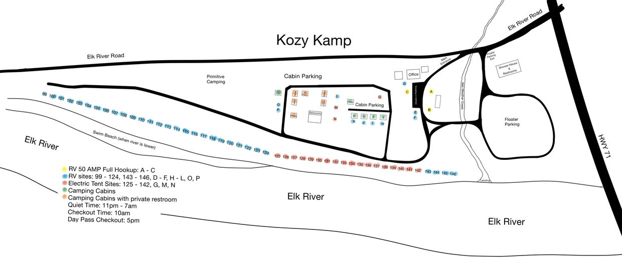 Kozy Kamp’s quiet time is 11 pm - 8 am. Friday night check-in is a two night minimum. Camping fees include restrooms, showers, and dumpsters for your trash.